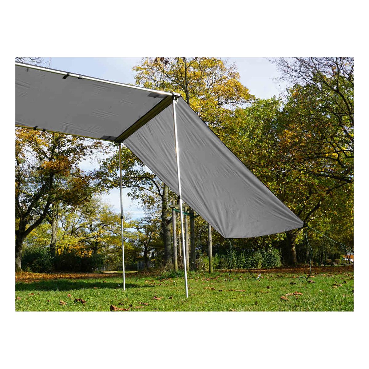 Mit der Erweiterung zur Fahrzeugmarkise steigt der Nutzwert der Markise nochmals an. Die Erweiterung wird einfach in die freie Kederschiene der Markise eingeschoben und dann nach Belieben verspannt. Als Wetterschutz / Sonnenschutz zur Seite oder um den Platz unter der Markise zu erweitern, ist dieses Teil mit seinen geringen Packmaßen und schnellem Aufbau ideal. Technische Daten: Maße: 150 x 200 cm Farbe: grau Lieferumfang: Plane mit Keder je 2 Seile und Erdnägel zum Abspannen