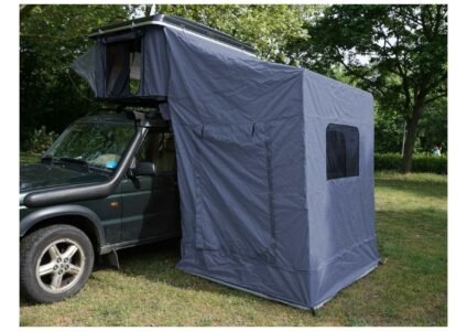Mit dem Vorzelt zum Dachzelt Nevada entsteht viel zusätzlicher Raum den man vielfältig nutzen kann. Der Einstieg in das Zelt erfolgt im Vorzelt und somit ist man vor Blicken und Witterung geschützt. Mit seiner üppigen Grundfläche von 200cm Beite (am Fahrzeug) und einer Tiefe von 180cm bietet das Vorzelt viel Platz. Das Vorzelt verfügt über einen Boden aus einer strapazierfähigen Plane. Die Bodenplane ist mit einem Reißverschluss versehen und kann somit leicht abgenommen werden. Die Zeltplane verfügt am…