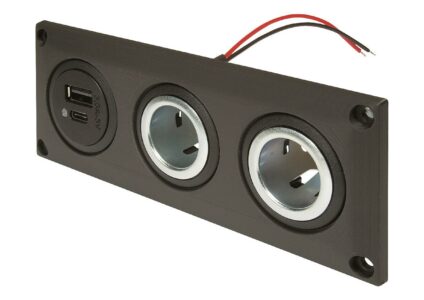 Konfektioniert mit 1 USB-C/A Doppelsteckdose mit blauer LED, 12-24 V DC, Ausgang 5 V DC mit integriertem Spannungswandler, max. 3,6 A. Input 8-34 V DC, E1-Zulassung, inkl. Schutz vor: Überlast, Verpolung, Übertemperatur, Kurzschluss, Überspannung bei kurzen Spannungsspitzen. Eigenverbrauch ≤ 1 mA. 2 Powersteckdosen 12-24 V, Innen-Ø der Steckdosen 21 mm. Passend für Universalstecker. Zum Betreiben von Zusatzgeräten in Auto, Boot und Caravan. Belastbarkeit: 20 A bei einem Kabelquerschnitt von 2,5 mm2, 16…