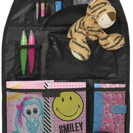 Rücksitztasche ausgestattet mit 3 großen Ablagefächern (z. B. für Tablets, Bücher, Zeitschriften, etc.), 2 kleine Staufächer (z. B. für Smartphones, Tassen, Brieftaschen, etc.) und 4 Stiftehalter. Einfach am Fahrzeugsitz mit 2 elastischen Gurten auf der Rückseite zu befestigen. Technische Daten: Gewicht: ca. 230 g Packmaß: 520 x 210 x 20 mm Farbe: schwarz