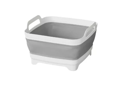Faltbare Spülschüssel mit Bodenablauf. Technische Daten: Gefaltete Höhe: ca. 7 cm Maße: 30 x 30 x 20 cm Gewicht ca.: 560 g Farbe: grau, weiß Volumen: ca. 18 Liter