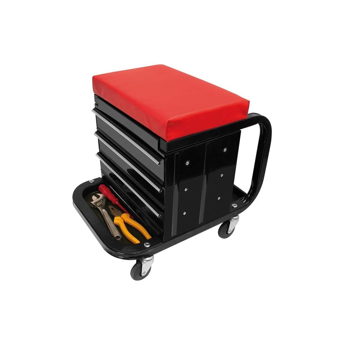 Der Ideale mobile Arbeitsplatz. Mit diesem praktischem Mulitfunktions Wagen befindet sich die Sitzgelegenheit sowie das benötigte Werkzeug dank 4 Schwenkrollen immer griffbereit. Merkmale: Kompakt und Robust 4 Schwenkrollen Geeignet für die Verwendung im Haus (z.B. Elektroarbeiten an Steckdosen usw.), am Auto, in der Werkstatt, Garage, im Schuppen, Lager usw Dank des praktischen und weichen Sitzpolsters sind allerlei Arbeiten weniger ermüdend und zeitraubend Inkl.mit 3 Schubladen Weiches Sitzkissen…