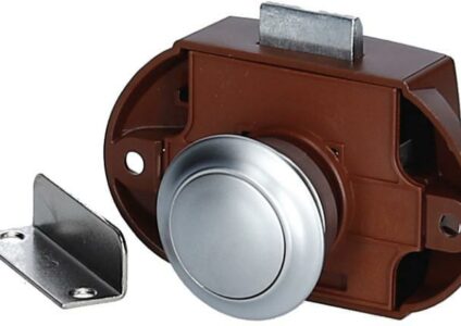 Einhandbedienung für Schranktüren und Schubladen Klein, rund, keine vorstehenden Teile Für 15 mm Plattenstärke Bei Druck auf den Knopf springt dieser vor und dient als Griff Lieferumfang: Bohr-Ø Rosette: 26 mm. Inkl. Schließblech