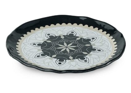 Schwarz-grau-brauner Teller für den Genuss im Freien. Dekor aus Blumen und Linien. Für das Pausenbrot oder einen kleinen Snack zwischendurch. Robust und unzerbrechlich Spülmaschinen geeignet Technische Daten Größe: Ø 22 cm Material: Melamin Farbe: schwarz gemustert Lieferumfang: 1 Teller