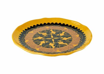Gelber-schwarz-brauner Teller für den Genuss im Freien. Dekor aus Blumen und Linien. Für das Pausenbrot oder einen kleinen Snack zwischendurch. Robust und unzerbrechlich Spülmaschinen geeignet Technische Daten Größe: Ø 27 cm Material: Melamin Farbe: gelb gemustert Lieferumfang: 1 Teller
