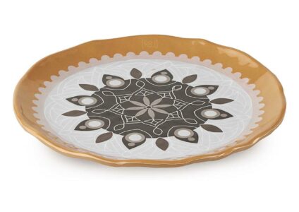 Lachsfarbener-schwarz-brauner Teller für den Genuss im Freien. Dekor aus Blumen und Linien. Für das Pausenbrot oder einen kleinen Snack zwischendurch. Robust und unzerbrechlich Spülmaschinen geeignet Technische Daten Größe: Ø 27 cm Material: Melamin Farbe: Lachsfarben gemustert Lieferumfang: 1 Teller