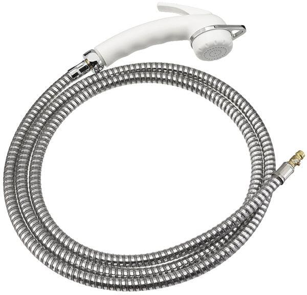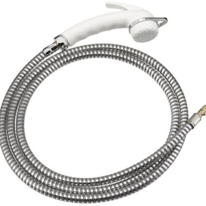 Stellbrause mit Abstellhebel. Inkl. verchromter Führungsrosette. Technische Daten:Brauseschlauch: 1,5 m.Brausekopf-Anschluss: 1/2Schlauch-Anschluss: 3/8Farbe: weiß