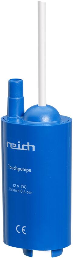 Einfache, langlebige und leistungsstarke Tauchpumpe von Reich. Material und Oberfläche der Pumpen sind leicht zu reinigen. Ohne Rückschlagventil und automatische Entlüftung. Dient häufig als Ersatz im Campingbereich. Technische Daten: Förderhöhe: 5 m Fördermenge: 15 l/min Nennspannung: (DC) 12 V Nennleistung: 20 W Kabellänge: 1 m Druck: 0,5 bar Durchmesser: 48 mm Packmaß: 175 × 161 × 51 mm Gewicht: 182 g