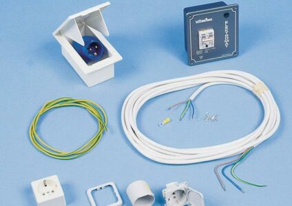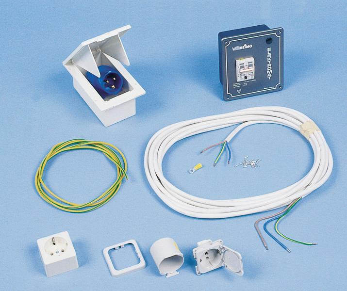 Einbausatz 230V Anlage Produkteigenschaften Komplett mit Einbausicherungsautomat mit Fehlerstromschutzschalter, Eingangssteckdose, 2 Innensteckdosen, Kabel, sowie allen Kleinteilen zur problemlosen Montage der 230 Volt-Anlage. 1 Aufbausteckdose weiß, 1 Einbausteckdose hellgrau mit Rahmen, 1 Berührungsschutzdose, 1 Einbauelektromat mit FI-Schalter, 1 CEE-Eingangsdose weiß, 3 m Kabel 3 x 1,5 mm², 2 m Erdungskabel grau/grün 4 mm², 2 Ringösen+Aderhülsen