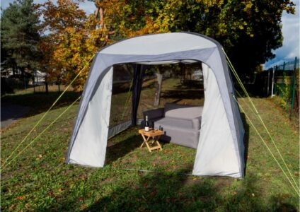 Nur 1 Luftschlauch/Aufblaspunkt Inkl. 4 Seitenwänden Für Camping, Garten, Party, etc. Weitere Seitenwände separat bestellbar für Optimierung nach Ihren Wünschen Seitenwände werden mit Haken und Klett befestigt Aufrollbare Tür in Seitenwand mit Reißverschluss Im Dach mit Haken ausgestattet z.B. für Lampe Lampenkabel lässt sich in der Luftschlauchhülle verlegen Technische Daten: Gewicht: 11,00 kg Breite: 350 x 350 cm Höhe: 170 – 215 cm Wassersäule: 3.000 mm Gestänge: Airtube Material: 185T Polyester…