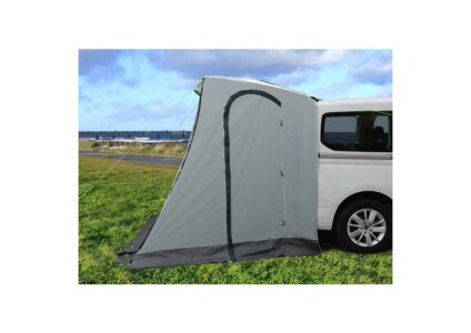 Heckzelt für VW Caddy 5 (ab 2021), das ohne Gestänge auskommt und einfach über die Heckklappe gezogen und mit angenähten Gurten und Kunststoffhaken fixiert wird. Die Vorderwand ist mit einer großen Reißverschlußtür mit zusätzlich Moskitonetz ausgestattet, die auch als Sonnensegel genutzt werden kann. Die Seitenwände haben je eine Reißverschlußtür mit einer zusätzlichen Moskitonetz-Lage und das Dach hat ein PVC-Fenster über dem Heckfenster. Die Bodenplane wird per Klett befestigt und ist jederzeit…