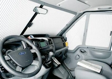Die Frontscheibe wird durch ein zweiteiliges Verschiebeelement mit Magnetverschluss verdunkelt. Dieses schließt in der Mitte der Frontscheibe, der Innenspiegel bleibt an seinem Platz. Passend für Ford Transit ab Bj. 2014 Euro 6 mit Sichtpaket