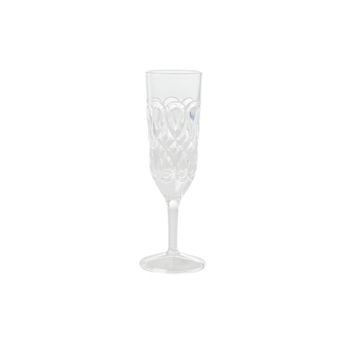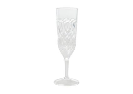 Klares, acryliertes Sektglas mit wirbelnden, geprägten Details – gut für den Innen- und Außenbereich. Das Acrylmaterial ist spülmaschinenfest… aber wenn man den schönen Kristall-Look und eine lange Haltbarkeit erhalten möchten, wird dringend empfohlen, das Material mit der Hand zu waschen. Handwäsche empfohlen Technische Daten: Material: Acryl Volumen: 250 ml Höhe: 21 cm Durchmesser: 6 cm Gewicht: 0.08 kg Farbe: transparent