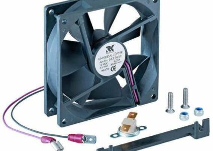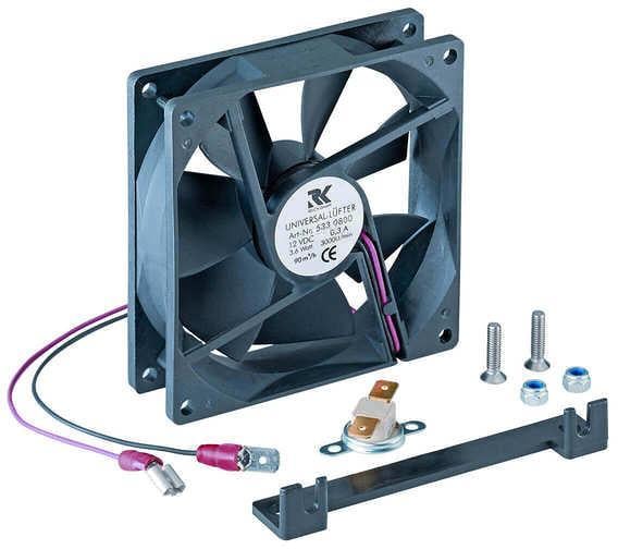 Der kollektorlose Motor macht eine Entstörung überflüssig. Der 12 V-Elektromotor arbeitet äußerst geräuscharm (nur 32 dBA). Die geringe Leistungsaufnahme von 2,6 W bringt den Motor bei 3.400 U/min. richtig „auf Touren“. Dabei fördert der Lüfter 83 m³ in der Stunde. Set bestehend aus Thermostatschalter mit einem Schaltpunkt bei 50° und Befestigungswinkel für die Montage z. B. an Absorber-Kühlschränken, lieferbar. Neben dem Einsatz als Kühlschrank-Lüfter kann der Universal-Lüfter für viele andere Zwecke…