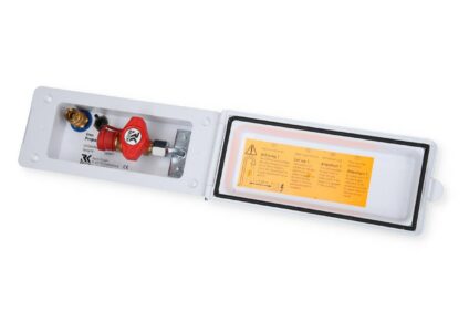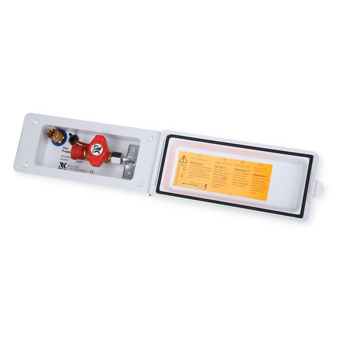 Versorgungsklappe mit je einer Steckdose für Gas- und Wasserentnahme im Freien. Nach Abziehen des jeweiligen Schlauches wird die Entnahme automatisch gestoppt. 12 V-Schalter zum Ein- und Ausschalten der Wasserpumpe Mit Gas-Absperrventil ohne Schlüssel / Schlüssel Technische Daten: Lochmaß: 160 x 70 mm Außenmaß: 216 x 94 mm Tiefe: 90 mm