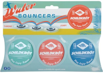 Wer schafft mit den Water Bouncers im trendigen Retro-Design die meisten Aufsetzer auf dem Wasser? Statt flachen Steinen kommen hier silikongefüllte Neoprenkissen zum Einsatz. Lasst die 3 Steinchen in einem möglichst flachen Winkel über das Wasser hüpfen. Sie gehen nicht unter und können somit immer wieder verwendet werden. Ein absolut tolles Erlebnis am See, im Meer oder am Pool für Kinder wie auch für Erwachsene. Technische Daten: Material: Polyester, Neopren, Silikon Durchmesser: Ø 7cm Gewicht: 55…