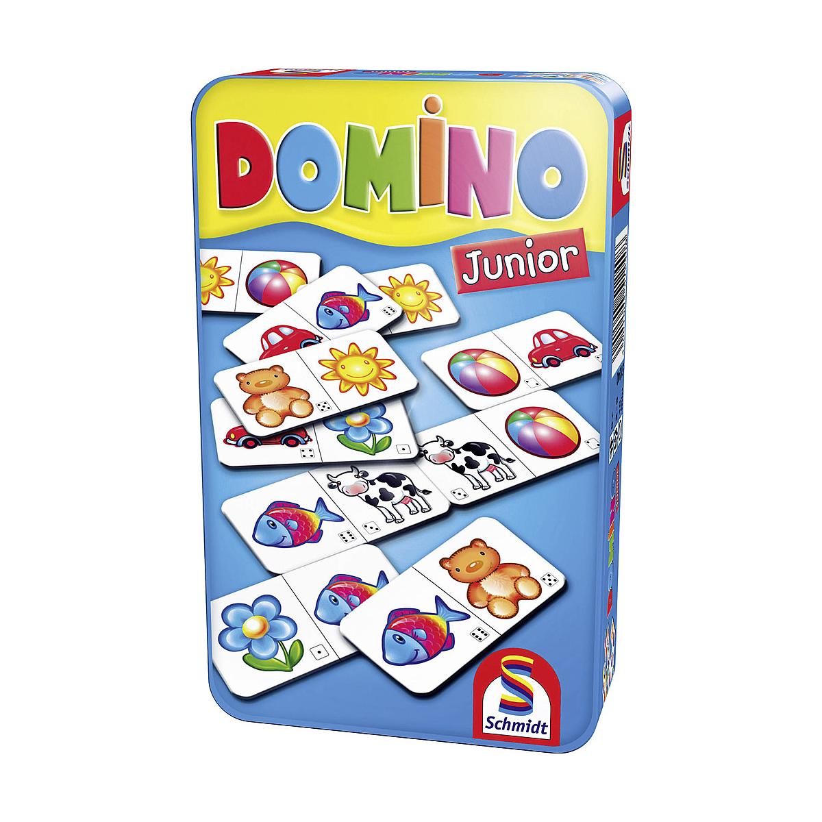 Kärtchen für Kärtchen entsteht eine bunte, immer länger werdende Kärtchenreihe. Die Kinder lernen, Motive zu erkennen und sie entsprechend zuzuordnen. Mit den bunten Motiven in der Metalldose macht der beliebte Legespiel-Klassiker mit stabilen Domino-Kärtchen jetzt noch mehr Spaß. Reisespiel Alles in einer Box Technische Daten: ab 3 Jahre 2 bis 6 Spieler Dauer: 10 min Gewicht: 310 g