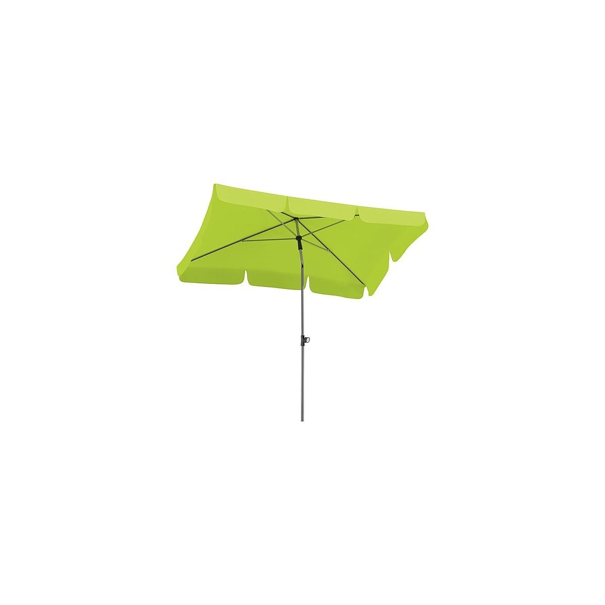 Ein stilvoller und stabiler Sonnenschirm. Bietet Schutz vor schädlicher Sonneneinstrahlung. Bespannung Polyester, ca. 160 g/m² Verrottungsfest Wasserabstoßend imprägniert mit Volant und Bandeinfassung Gestell pulverbeschichtet Großer Schieber mit Taste Drehfeststeller Kugeltop Metallknicker mit Druckknopf Stock 2-teilig, Ø 22/25 mm Technische Daten: Material Schirm: 100 % Polyester Größe: 180 x 120 cm Gestell: silbergrau Kunststoffteile: anthrazitgrau Farbe: apfelgrün