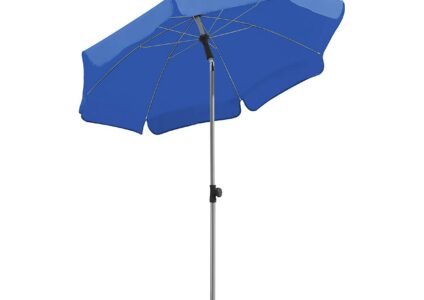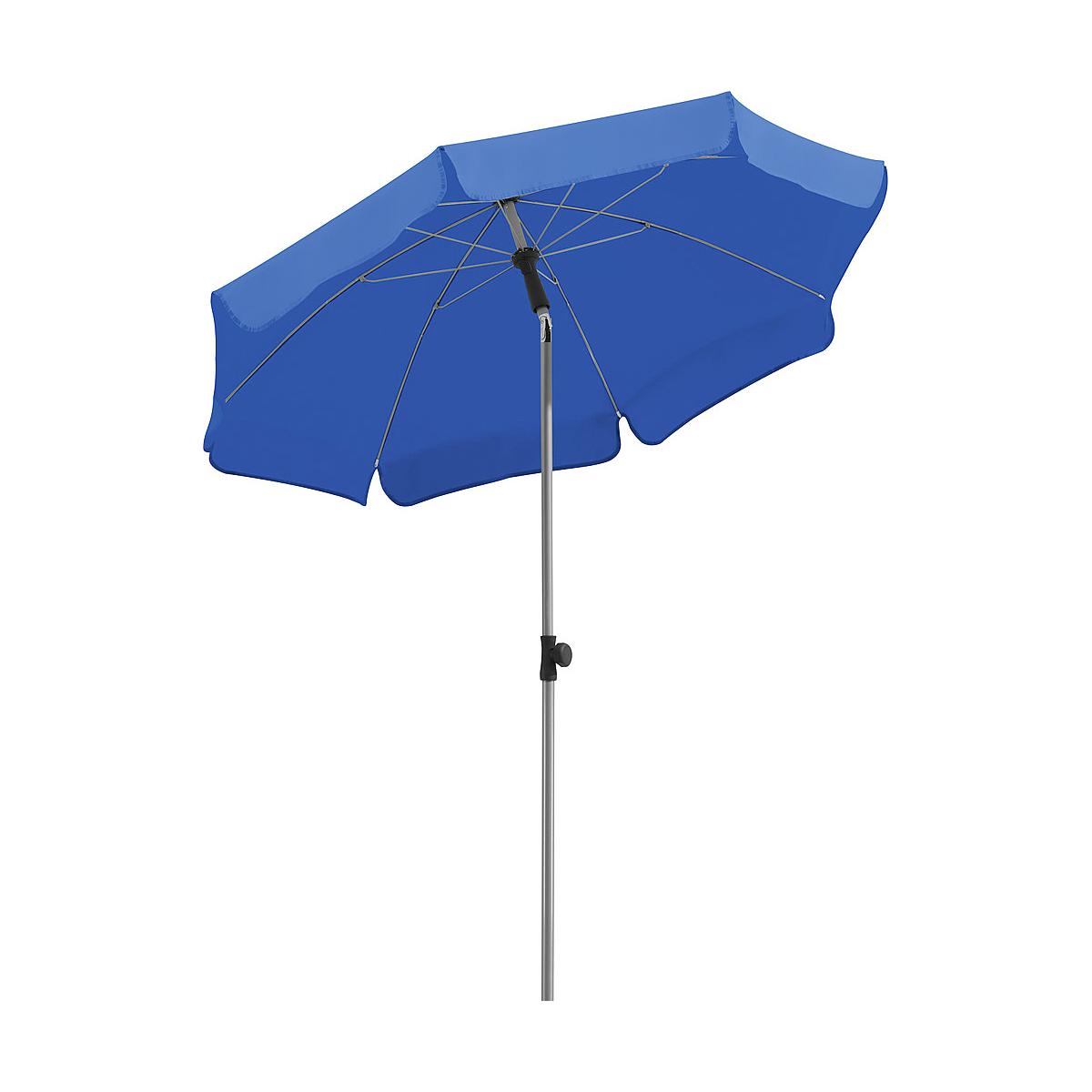 Ein stilvoller und stabiler Sonnenschirm. Bietet Schutz vor schädlicher Sonneneinstrahlung. Bespannung Polyester, ca. 160 g/m² Verrottungsfest Wasserabstoßend imprägniert UPF 50+ Gestell pulverbeschichtet Großer Schieber mit Taste Drehfeststeller Kugeltop Metallknicker mit Druckknopf Stock 2-teilig, Ø 22/25 mm Technische Daten: Material Schirm: 100 % Polyester Durchmesser: Ø 200 cm Gestell: silbergrau Kunststoffteile: anthrazitgrau Farbe: royalblau