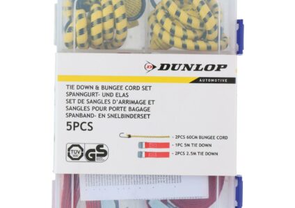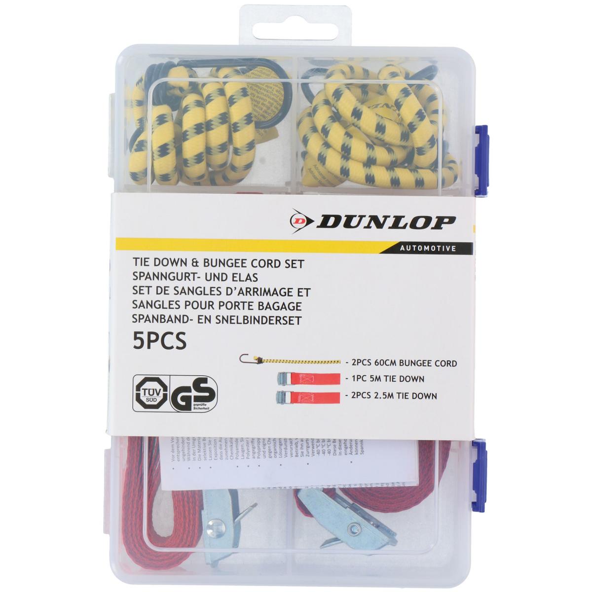 Schnellverriegelungszurrgurt-Set. 5-teiliges Set bestehend aus 2 Expanderkabeln 60 cm, 1 Abspanngurt 500 cm und 2 Abspanngurten 250 cm. Inklusive Kunststoffbox.