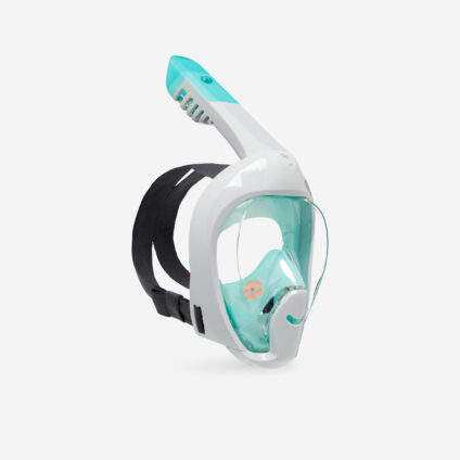 Eine Schnorchelmaske. die sich dem Gesicht des Kindes anpasst. mit der man durch Nase/Mund atmen und gleichzeitig die Unterwasserwelt mit Panorama-Sicht bewundern kann. Vollgesichtsmaske für eine natürliche Atmung durch Nase und/oder Mund|Exklusives Konzept mit Luftzirkulation. damit die Scheibe nicht beschlägt.|Rundum-Sicht. 180°-Effekt |„Dry Top Release“-Schnorchel. so kann kein Wasser in den Schnorchel eindringen.