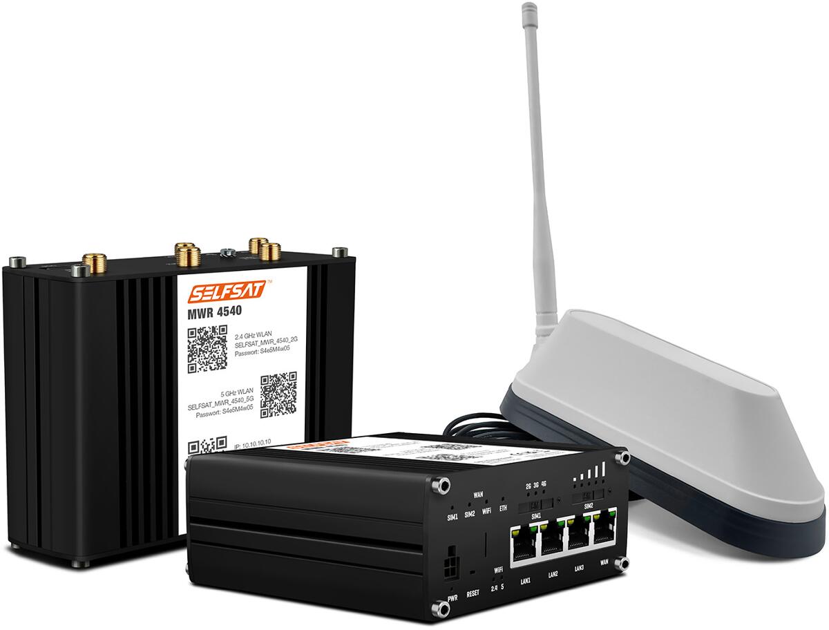 Selfsat MWR 4540 4G Cat 6 WLAN Router + SHARK 5G AntenneSchnelles und stabiles Internet für unterwegs: Dieses Komplettset bringt Highspeed LTE mit bis zu 300 Mbps in Ihr Wohnmobil, Caravan oder Boot. Die SHARK 5G Außenantenne garantiert optimalen Empfang – selbst in abgelegenen Regionen. Dank Dual-SIM, GPS-Ortung und DAB+ Anschluss sind Sie flexibel und immer bestens vernetzt.LTE Cat 6 Router mit bis zu 300 MbpsSHARK 5G Dachantenne für extra ReichweiteDual-SIM für zwei AnbieterCampingplatz-WLAN &…