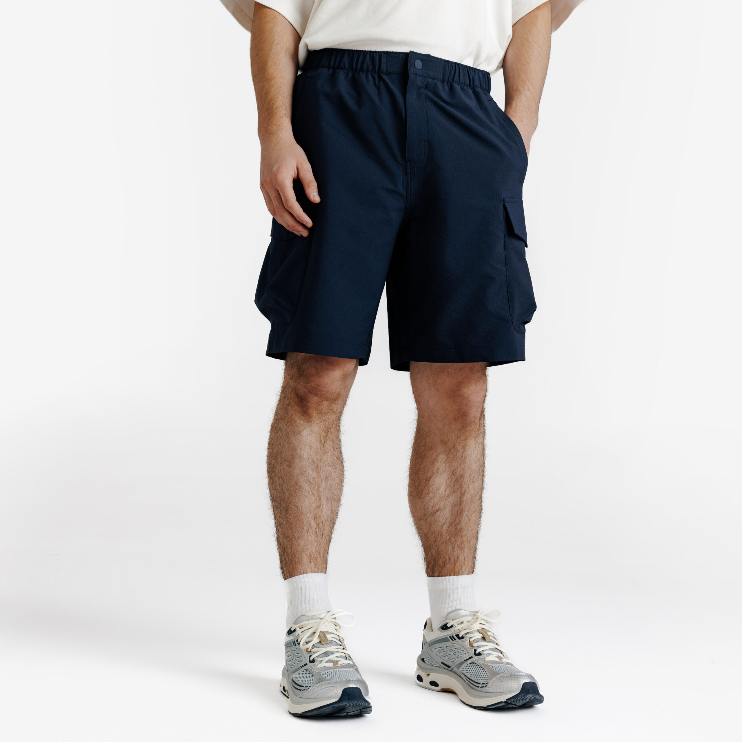 Shorts mit besonderer Materialstruktur, lockerem Schnitt und im Alltag sehr nützlichen funktionellen Merkmalen: atmungsaktiv, mehrere Taschen. Einfache Instandhaltung::Pflegeleichtes Seersucker-Material mit natürlicher Knitterstruktur|Atmungsaktivität::Reduzierte Kontaktfläche mit der Haut durch Struktur des Seersucker-Materials