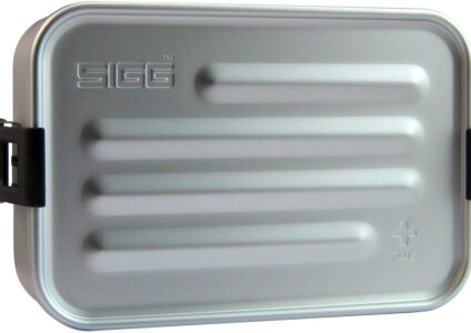 Preisgekrönt und federleicht. Die klassische SIGG Food Box wurde rundum erneuert und mit einigen hervorragenden Eigenschaften ausgestattet. Der Silikoneinsatz ist spülmaschinen- und mikrowellengeeignet. Ein Trenner aus Polypropylen kommt zum Einsatz. Und auch das ausgeklügelte Schließsystem wurde nochmals verbessert. mit Silikoneinsatz mit Trenner Technische Daten: Volumen: 900 ml Farbe: silber Maße: 17 x 11,7 x H 6 cm Gewicht: 255 g Material: Aluminium / Silikon / Polypropylen