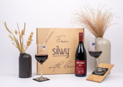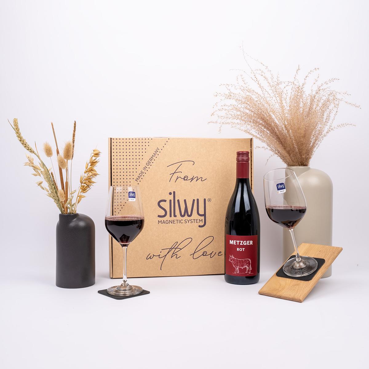Die umfangreiche Geschenkbox von silwy mit seinen hochwertigen Tritan Kristallgläsern aus dem Bayerischen Wald. Eine Box mit Liebe zusammengestellt aus den magnetischen komponenten des silwy Sortiments und einer passend abgestimmten Flasche. Werde Fan von silwy dem Start-Up Unternehmen und seinem jungem Team. Geschenkbox mit Rotwein & silwy Magnet-Kristallgläsern integrierte & vergossene Magneten im Glasboden Tritan-Kristallglas aus dem Bayerischen Wald Untersetzer & silwy Gläser mit perfektem…