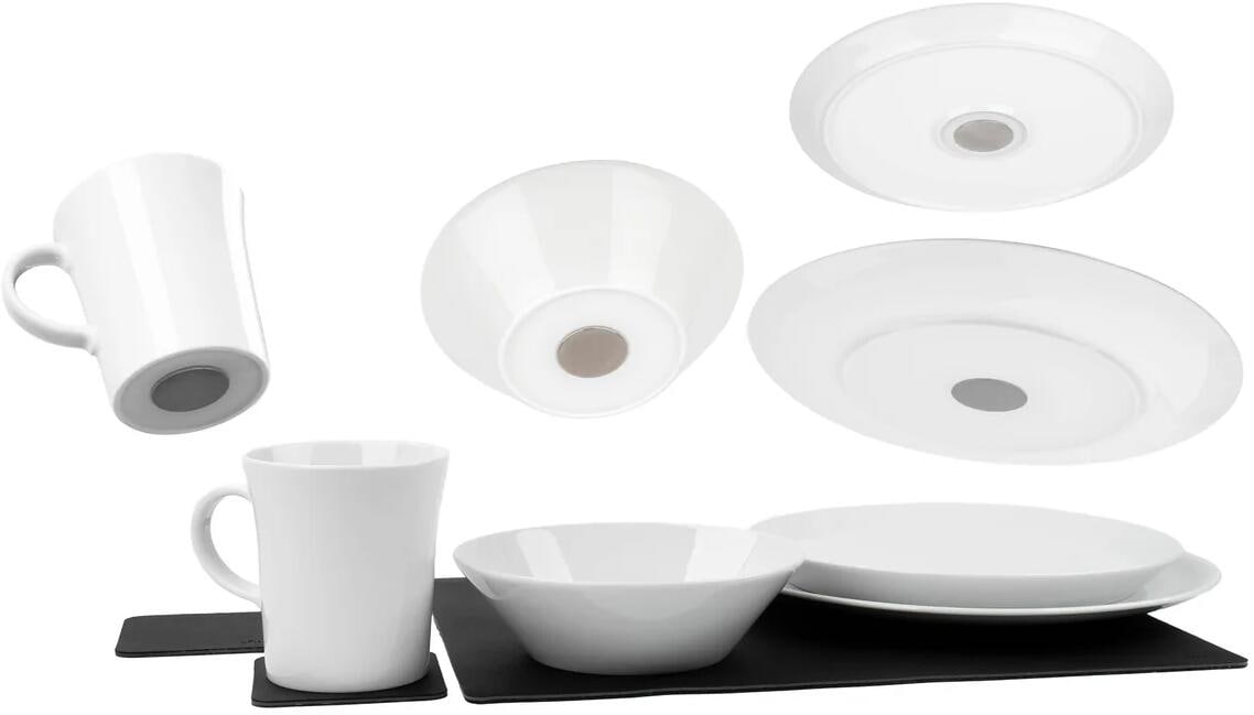 Klapperfrei Reisen dank smarter Magnetlösung. Komplett-Ausstattung aus feinstem Porzellan.Im Boden der Geschirr-Kollektion ist ein formschön von Hand vergossener Magnet integriert. Damit das Geschirr während der Fahrt an Ort und Stelle bleibt, muss es mit einem metallischen Gegenpol kombiniert werden. Im Set sind hierfüreine passende Metall-Nano-Gel-Matte sowie auch zwei Metall-Nano-Gel-Pads inklusive. Das Kraftverhältnis zwischen dem Magnet-Geschirr und dem Metall-Nano-Gel-Zubehör ist perfekt…