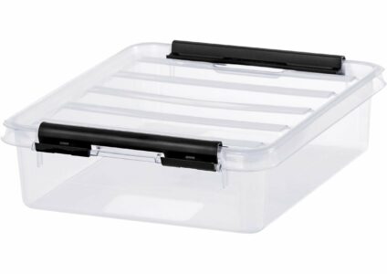 Kleine und praktische Aufbewahrungsbox für kleine Gegenstände. Perfekt zur Aufbewahrung aller Arten von Kleinigkeiten wie Kosmetika, Stifte, Buntstifte, Nähzubehör oder Perlen. Kästen ohne Deckel lassen sich ineinander stecken und mit Deckel lassen sie sich stapeln. Die seitlichen Clips halten den Deckel sicher in Position. Geeignet zur Aufbewahrung von Lebensmitteln. Technische Daten: Maße: 21 x 17 x 6 cm Fassungsvermögen: 1 Liter Gewicht: 109 g Farbe: transparent