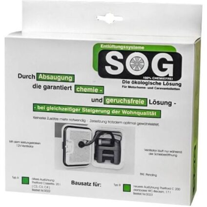 SOG®TT, die erste Entlüftungsanlage auf dem Markt zur innovativen Optimierung für Trocken-Trenntoiletten, schafft Abhilfe gegen die störende Geruchsbelästigung in den begrenzten Räumen von Freizeitfahrzeugen SOG®TT zeichnet sich durch eine speziell optimierte Filtereinheit mit integriertem Lüfter aus. Der Lüfter kann, durch seine optimale Konstruktion, wahlweise mit einem Schalter an der Fahrzeuginnenwand separat geschaltet werden, oder dank seines geringen Stromverbrauchs von 1,2 Watt dauerhaft laufen….
