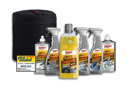 CARAVAN Pflegeprodukte griffbereit und praktisch verstaut! Sechs Produkte für Innen und Außen. Einfache Anwendung mit überzeugender Wirkung Für Reinigung, Pflege und dauerhaften Werterhalt 1. CARAVAN Shampoo Löst schonend Schmutz und versiegelt in einem Arbeitsgang Mit hochwertigem, natürlichen Carnauba-Wachs Geeignet für alle außen liegenden Oberflächen, auch für Acrylglasfenster Für Caravan, Campingbus, Wohnmobil, Kastenwagen und Wohnwagen 2. CARAVAN RegenstreifenEntferner Zur Entfernung von…