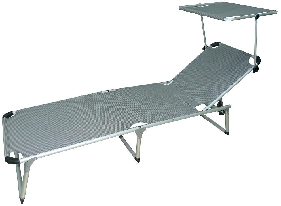 Wetterfeste, komfortable Liege mit stabilem Aluminium-Gestell aus wetterfester textilener Bespannung und Sonnenschutz. kappbare Ausführung stabiles Gestell Technische Daten: Farbe: taupe Belastbarkeit: bis 100 kg Material: 70 % PVC, 30 % Polyester Maße (LxBxH): 186 x 60 x 30cm Gewicht: ca. 6 kg Packmaß: 80 x 58 x 25 cm Lieferumfang: 1x Sonnenliege mit Sonnenschutz