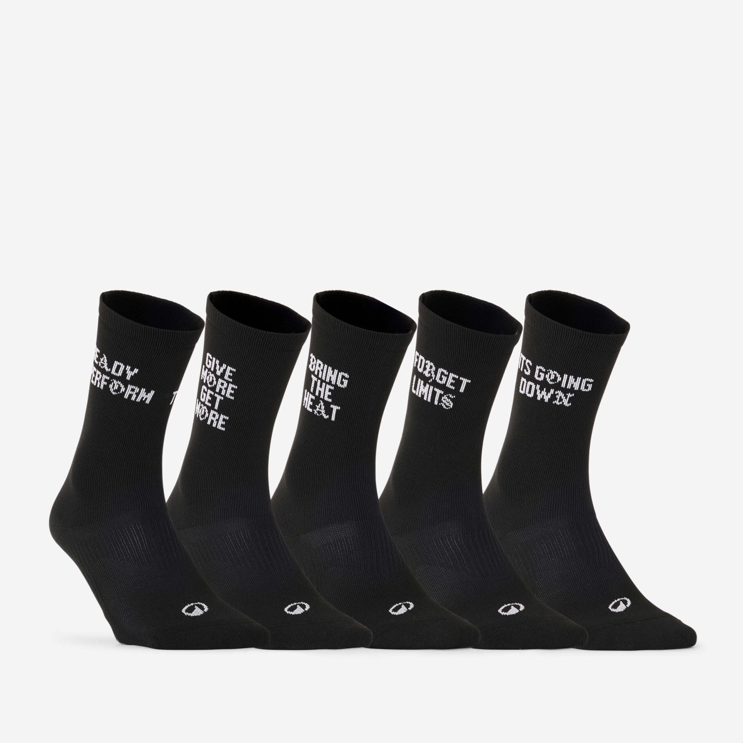 Fünf Paare für uneingeschränktes Training Tag für Tag. Durch die spezielle Strickart rutschen die Socken nicht. Verstärkungen schützen Ferse und Zehen vor wiederholter Reibung. Reduziert Hautreizungen::Funktionales Garn für weniger Blasenbildung|Feuchtigkeitsableitung::Gewebe auf der Oberseite absorbiert Feuchtigkeit und leitet sie nach außen ab|Tragekomfort::Zusätzliche Verstärkung an Ferse und Zehen|Halt::Guter Halt am gesamten Fuß durch die spezielle Strickart
