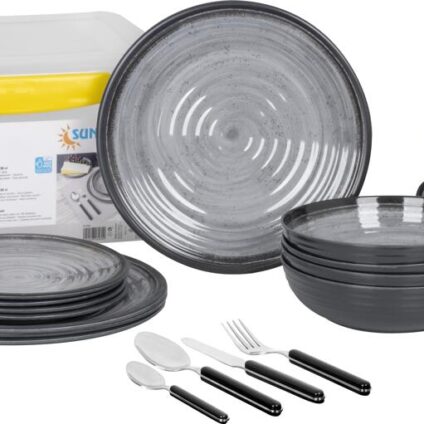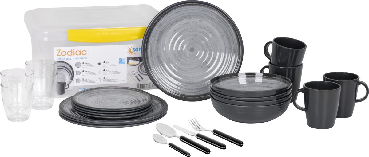 Melamin ist ein hochwertiger Kunststoff, der sich aufgrund der folgenden Eigenschaften besonders gut für den täglichen Outdoor-gebrauch eignet. hitze- und freuchtigkeitsbeständig sehr harte Oberfläche stoß- und schlagfest umweltfreundlich durch langlebigkeit Technische Daten: Modell: Zodiac Farbe: schwarz Material: Melamin Im Set enthalten: 4 Becher 16 Teiliges Besteck 4 Tassen 4 Tiefteller 4 Flachteller 4 Kleinteller 1 Box
