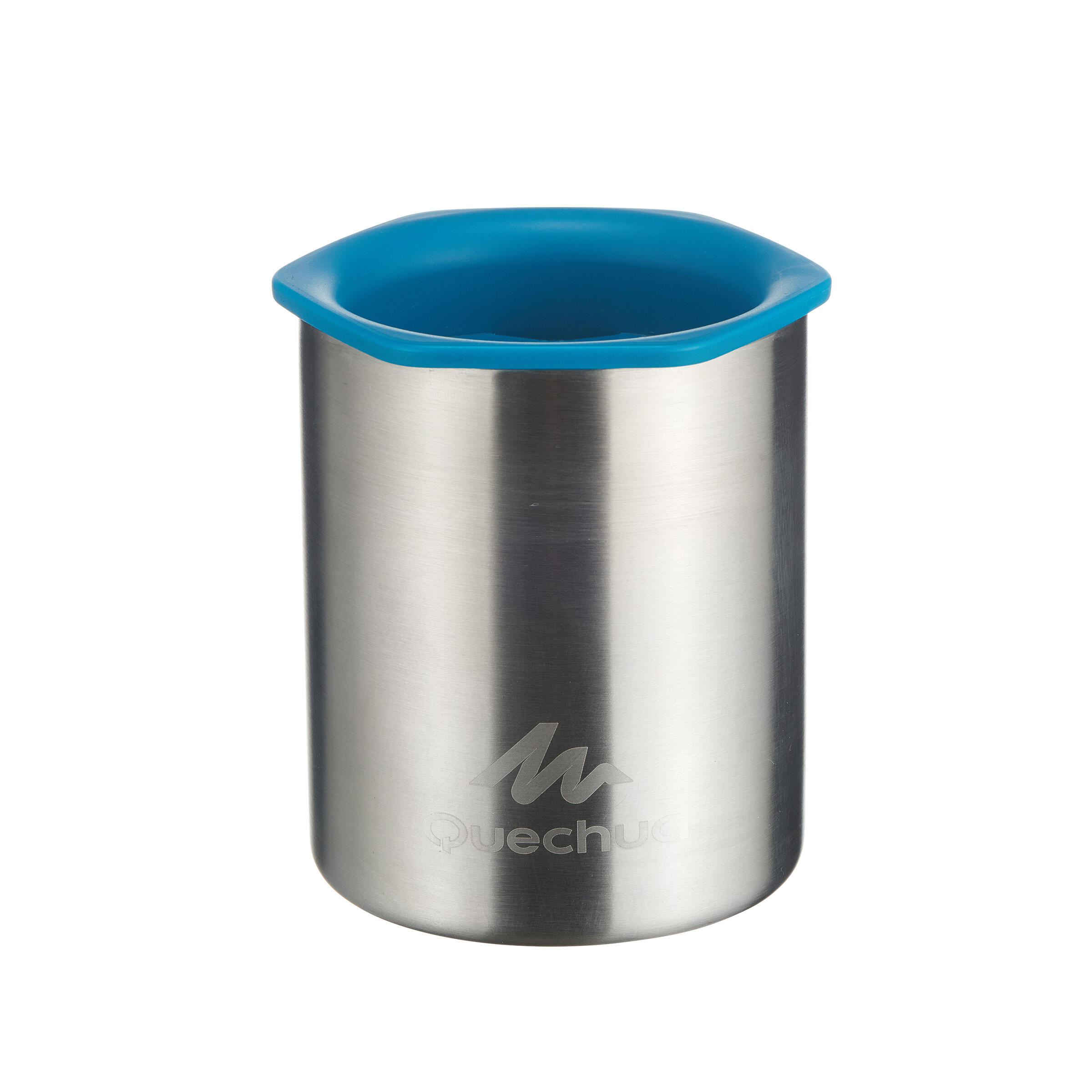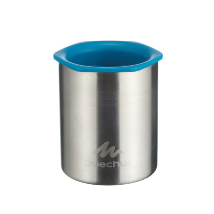 Campingtasse aus Edelstahl, damit du deinen Tee oder Kaffee trinken kannst, ohne dich zu verbrühen.