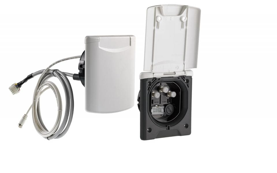 Eigenschaften: Material: ABS PAS/F – Anschluss ActivSat Fawo Farbe: außen weiß, innen schwarz Eingänge: Steckverbinder für Motorkabel ActivSat 10-polig F-Steckverbinder für Koaxialkabel ActivSat F-Steckverbinder für zweites Koaxialkabel (ActivSat Twin) F-Steckverbinder für Koaxialkabel für externes TV 12 Vdc Universalsteckdose (max. 10A) mit Gummiabdeckung und Faston für die Versorgung des externen TVs Lieferumfang: Externe Steckdose