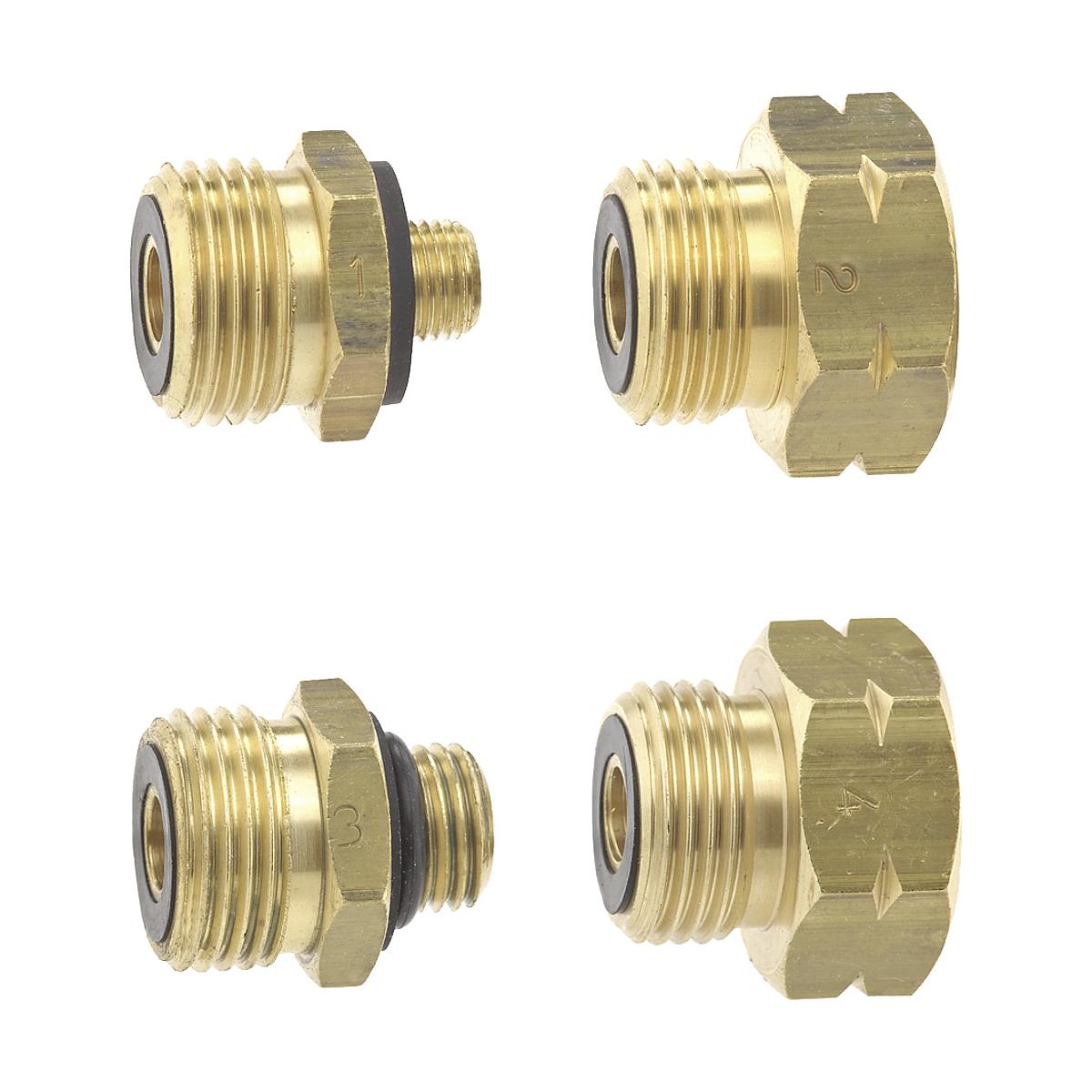 4 Zwischenstücke, damit paßt jeder deutsche DIN-Regler an zahlreiche ausländische Gasflaschen. 1 Italien, Schweiz =Vetta Gas 2Italien =Liqui-, Butan-, Agip, Mi-, Pibi-Gas 3Norwegen, Österreich, Portugal,Schottland, Schweiz, Italien, Schweden =Primus-, Pibi-, Kosan-Gas 4Dänemark, England, Frankreich, Holland,Italien, Österreich, Schweiz, Spanien =Nordisk-Flaskengas, Calor-, Botto-, Esso-, Thermo-, Drachen-,Primus-, Butano-, Oban-Gas