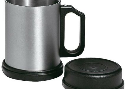 Thermobecher aus Edelstahl mit Kunststoffgriff, Kunststoffdeckel mit Isolierwirkung und abnehmbarem Fuß. Technische Daten: Volumen: 0,4 Liter Maße: 8,0 x 12,5 cm Gewicht: 280 g Material: Edelstahl