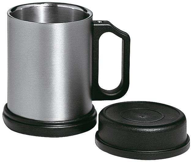 Thermobecher aus Edelstahl mit Kunststoffgriff, Kunststoffdeckel mit Isolierwirkung und abnehmbarem Fuß. Technische Daten: Volumen: 0,4 Liter Maße: 8,0 x 12,5 cm Gewicht: 280 g Material: Edelstahl
