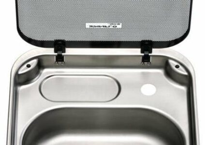 Thetford Series 34 Spülbecken mit Glasdeckel. Mit schwarzem Glasdeckel Aus rostfreiem Edelstahl Technische Daten: Abflüßöffnung: ø39 mm Abwasseranschluss ø25 mm Fassungsvermögen: 7,5 Liter Montageloch für Wasserhahn: (35mm) Ausschnittmaße B 38,7 x H 14,5 x T 42,9 cm Außenmaße B 40 x H 14 x T 44,5 cm Beckeninnenmaße B 33,8 x H 9,2 x T 28 cm Gewicht 2,9 kg