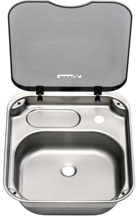 Thetford Series 34 Spülbecken mit Glasdeckel. Mit schwarzem Glasdeckel Aus rostfreiem Edelstahl Technische Daten: Abflüßöffnung: ø39 mm Abwasseranschluss ø25 mm Fassungsvermögen: 7,5 Liter Montageloch für Wasserhahn: (35mm) Ausschnittmaße B 38,7 x H 14,5 x T 42,9 cm Außenmaße B 40 x H 14 x T 44,5 cm Beckeninnenmaße B 33,8 x H 9,2 x T 28 cm Gewicht 2,9 kg