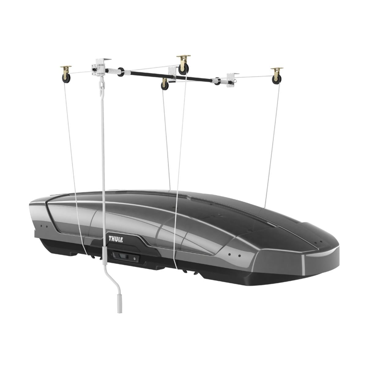 Die perfekte Lösung, eine Dachbox zu lagern. Auch für Kajaks und Surfbretter geeignet. Montage an Garagendecken/Carports. Vormontiert mit Bohrschablone zum einfachen Anbringen Einfaches Anheben der Last mit Hilfe des Haltebügels. Trägt Lasten bis zu 100 kg Funktioniert perfekt mit Dachboxen, Kajaks, Surfbrettern usw. Technische Daten Gewicht: 3.4 kg Länge: 91.50 Höhe: 152.5 Lieferumfang: 1 x Lagerlift ohne Dachbox
