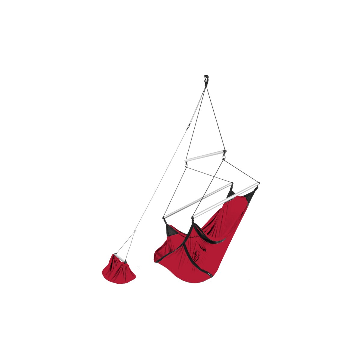 Vertikal hängender und tragbarer Hängestuhl. komfortabel schnell trocknend maschinenwaschbar bei 30°C verstellbar inkl. Fußstütze zertifiziert OEKO-TEX® Technische Daten: Material: Fallschirm-Nylon Taschenabmessungen: 98 cm x 15 cm Gewicht: 1700 g Max. Last: 120 kg Lieferumfang: 1x Moon Chair 1x Tragetasche 1x Fußstütze 1x Hängeseil 1 x Karabiner