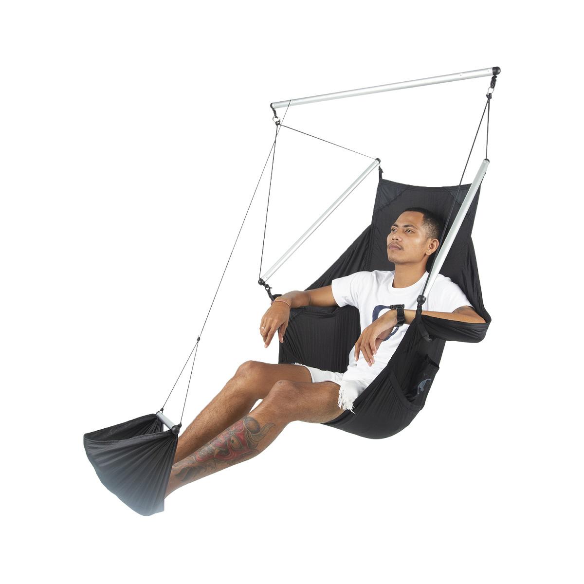 Vertikal hängender und tragbarer Hängestuhl. komfortabel schnell trocknend maschinenwaschbar bei 30°C verstellbar inkl. Fußstütze zertifiziert OEKO-TEX® Technische Daten: Material: Fallschirm-Nylon Taschenabmessungen: 98 cm x 15 cm Gewicht: 1700 g Max. Last: 120 kg Lieferumfang: 1x Moon Chair 1x Tragetasche 1x Fußstütze 1x Hängeseil 1 x Karabiner