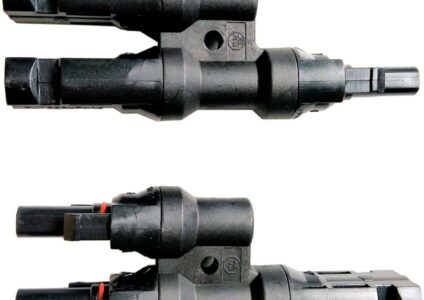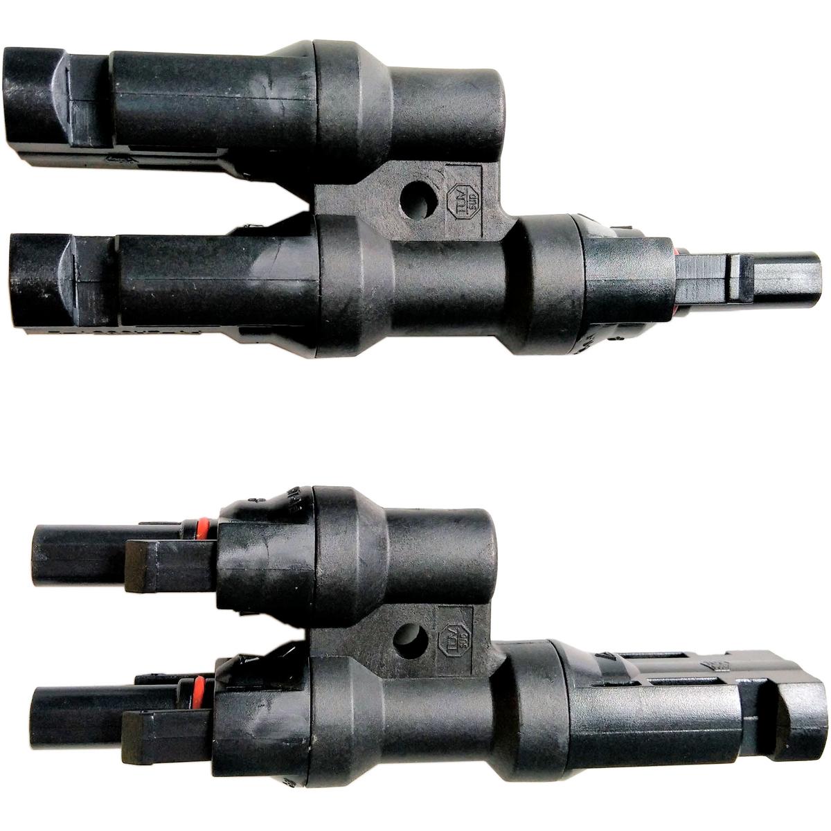 MC4-Y-Adapter um 2 Module oder Modulstränge parallel zu schalten. Achtung: MC4 ist bis max. 30A spezifiziert, d.h. der Summenstrom bei Parallelschaltung darf diesen Wert nicht überschreiten. Dazu die Summe der Ströme im Maximum Power Point bilden – manchmal steht auch Nomianalstrom im Datenblatt. Oben drauf bitte noch mind. 10% Puffer rechnen, damit der Winter (Mehrleistung durch Temperaturen unter den Testbedingungen, bei denen die Leistung der Module angegeben wird.) MC4 Splitter um 2 Panele…