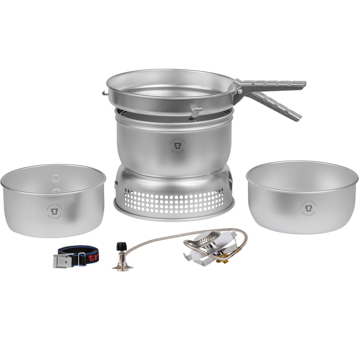 Die Serie 25 umfasst etwas größere Kocher, die für Gruppen von etwa 3-4 Personen geeignet sind. Sie sind ausgezeichnete Familienkocher mit geräumigen Pfannen, einer breiteren Bratpfanne und einem größeren Wasserkocher. Mit den Stützen in der angehobenen Position kann der Kocher mit großen Billies aus dem übrigen Trangia-Sortiment verwendet werden. für 3-4 Personen Technische Daten: Abmessungen: Ø220 mm x H105 mm. Brennstoff: Propan/Butangas Wirkung: 2100w Gesamtgewicht: 930g Lieferumfang: Kochtopf 1,5l…