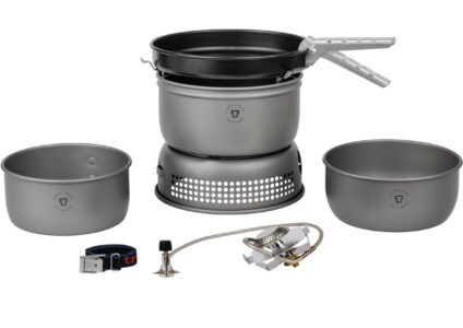 Die Serie 25 umfasst etwas größere Kocher, die für Gruppen von etwa 3-4 Personen geeignet sind. Sie sind ausgezeichnete Familienkocher mit geräumigen Pfannen, einer breiteren Bratpfanne und einem größeren Wasserkocher. Mit den Stützen in der angehobenen Position kann der Kocher mit großen Billies aus dem übrigen Trangia-Sortiment verwendet werden. für 3-4 Personen Technische Daten: Abmessungen: Ø220 mm x H105 mm. Brennstoff: Propan/Butangas Wirkung: 2100w Gesamtgewicht: 980g Lieferumfang: Kochtopf 1,5l…