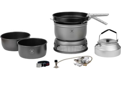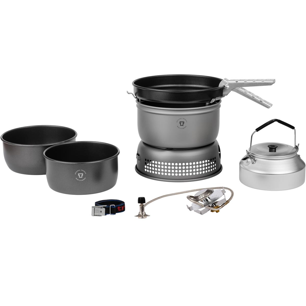 Die Serie 25 umfasst etwas größere Kocher, die für Gruppen von etwa 3-4 Personen geeignet sind. Sie sind ausgezeichnete Familienkocher mit geräumigen Pfannen, einer breiteren Bratpfanne und einem größeren Wasserkocher. Mit den Stützen in der angehobenen Position kann der Kocher mit großen Billies aus dem übrigen Trangia-Sortiment verwendet werden. für 3-4 Personen Technische Daten: Abmessungen: Ø220 mm x H105 mm Brennstoff: Propan/Butangas Wirkung: 2100w Gesamtgewicht: 1170g Lieferumfang: Kochtopf 1,5l…